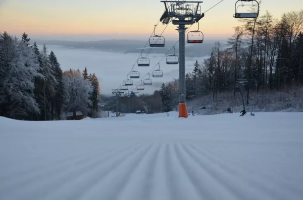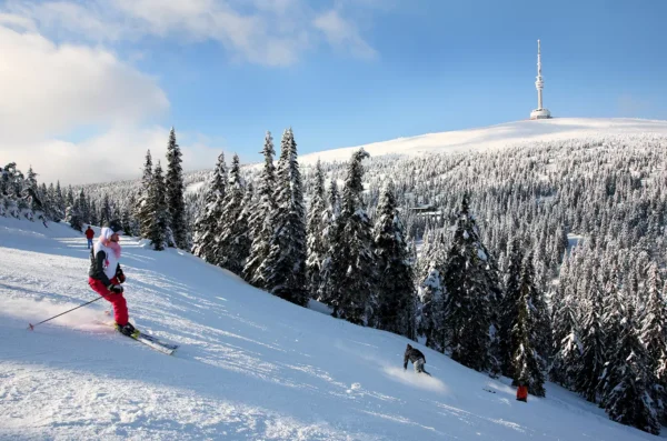 Ještěd near Liberec offers excellent conditions for downhill skiing with modern facilities. The slopes cater to all levels, from beginners to advanced skiers. The resort also offers night skiing and stunning views from the iconic Ještěd Tower.